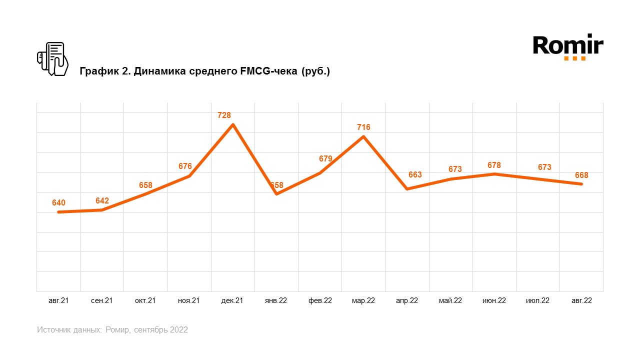 Средний чек FMCG-покупок в августе составил 668 рублей, что на 0,8% (5 рублей) меньше, чем в июле. За год показатель вырос на 4,4% (28 рублей).