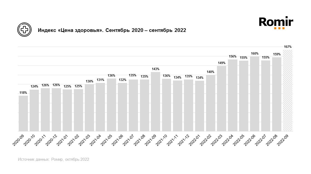 В сентябре цены на лекарственные препараты выросли на 5,0% по сравнению с августом. В преддверии сезона простуды противопростудные препараты подорожали на 12%, а противовирусные – на 13%. Индекс «Цена здоровья» составил 167%. При этом годовой рост цен остался на прежнем уровне и составил 16,8%.