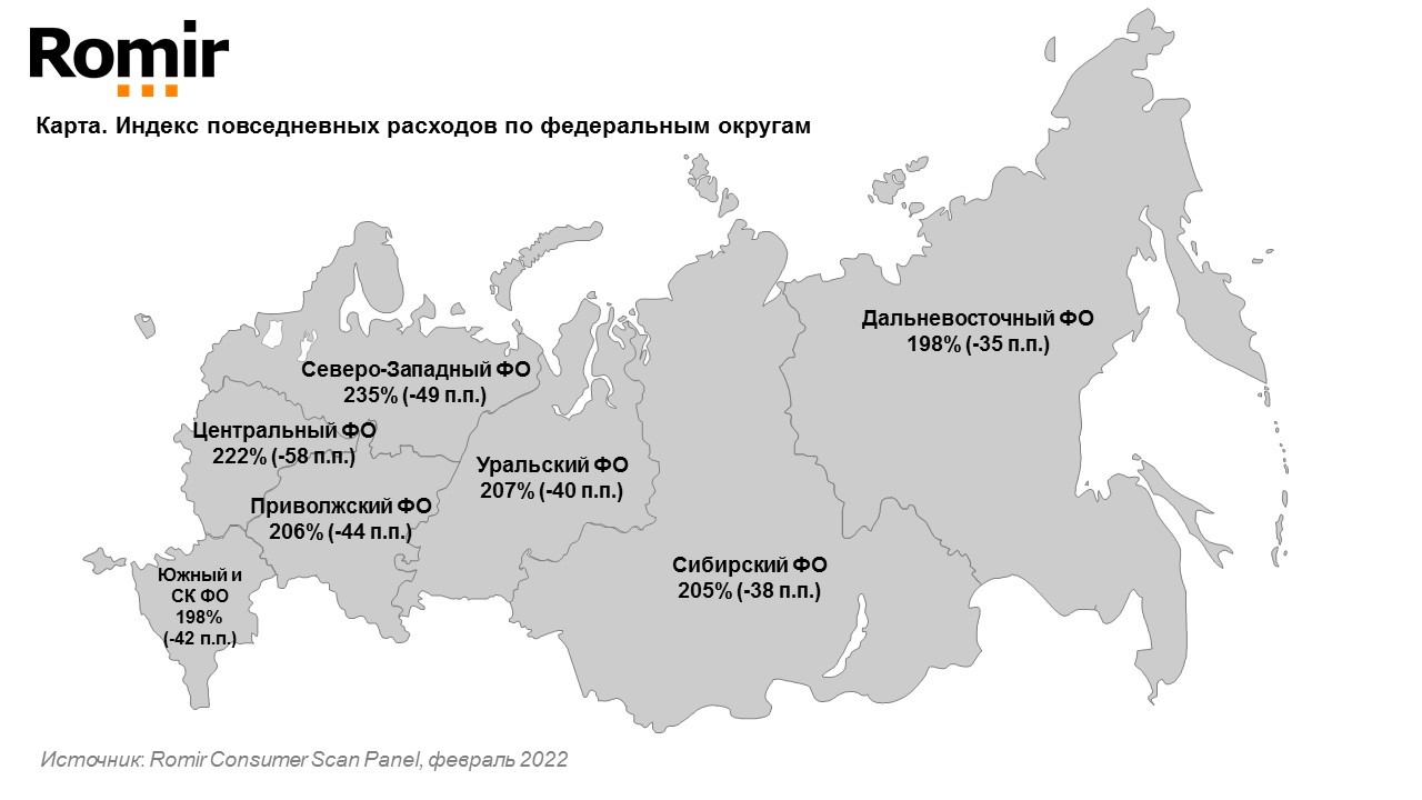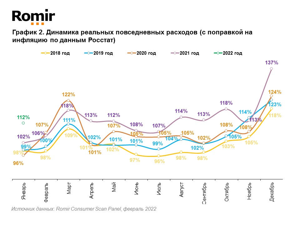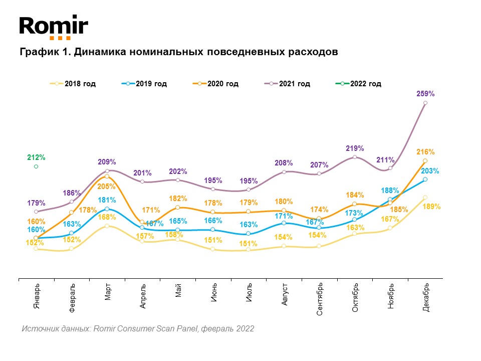 Согласно результатам панельного исследования Romir Consumer Scan Panel** в январе 2022 года индекс повседневных номинальных (без поправки на инфляцию) расходов россиян составил 212%, что на 47 п.п. меньше, чем в декабре 2021. В годовой динамике индекс увеличился на 33 п.п. (179%-2021 vs 212%-2022).