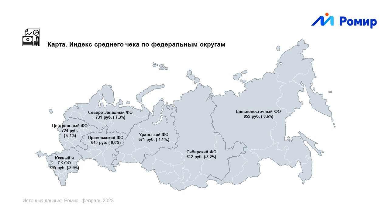 В разрезе по федеральным округам наибольшее сокращение среднего чека по сравнению с декабрем показал Южный и Северо-Кавказский ФО (-8,9%). Меньше всего показатель сократился в Уральском ФО (-4,1%).