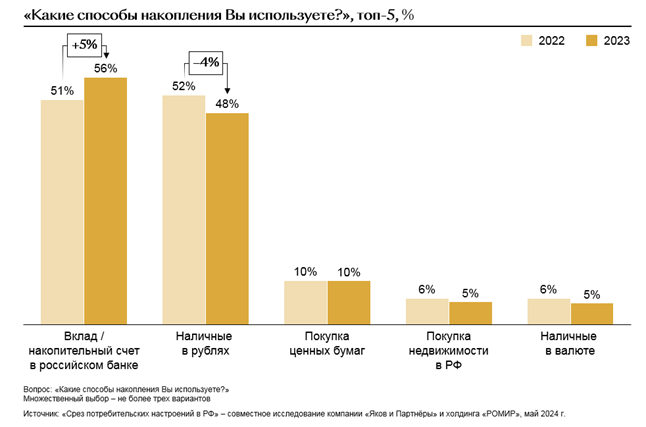 Как отмечает директор института «Яков и Партнёры» и соавтор исследования Елена Кузнецова, в отличие от прошлого года, теперь наиболее популярным способом накопления у россиян стали вклады и накопительные счета в российских банках (56%), а наличные в рублях используют для хранения сбережений менее половины респондентов (48%). «Более половины опрошенных в возрасте от 18 до 37 лет предпочитают использовать наличные в рублях в качестве основного средства накопления. Чем старше респонденты, тем больше среди них тех, кто хранит свои сбережения не в наличных рублях, а во вкладах в российских банках. При этом представители всех поколений не считают валютную наличность значимым способом сбережения средств», – уточнила она.