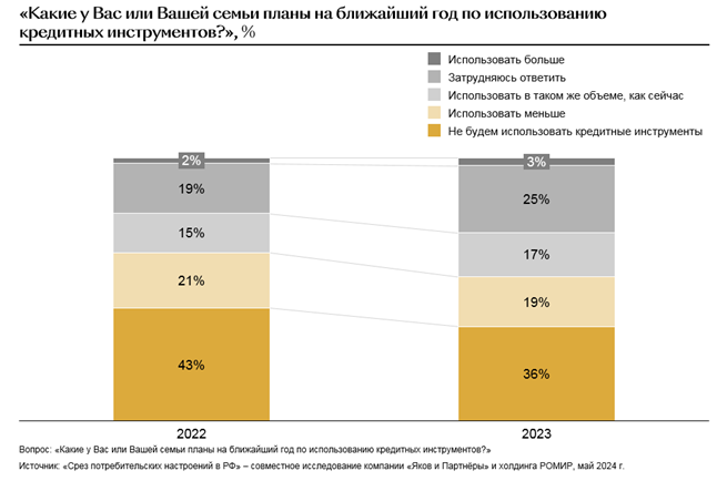 По словам исполнительного директора РОМИР Инны Караевой, на фоне роста кредитных ставок в России значительно увеличилось количество респондентов, которые пока не определились, будут ли они использовать в ближайший год различные кредитные инструменты. «Активнее всего кредитными инструментами намерены пользоваться зумеры – респонденты в возрасте 18–19 лет. Отвечая на вопрос „Какие у Вас или Вашей семьи планы на ближайший год по использованию кредитных инструментов?“, 25% зумеров выбрали вариант ответа „В таком же объеме, как сейчас“, а 6% ответили: „Использовать больше“. Ожидаемо наиболее высокую предрасположенность к использованию кредитных инструментов демонстрируют респонденты с высоким уровнем дохода. Но при этом примечательно, что треть (29%) жителей Москвы и Санкт-Петербурга еще не определились относительно того, прибегать ли им к помощи кредитных инструментов или нет», – пояснила Инна Караева. Более трети опрошенных (36%) не собираются в ближайшей перспективе пользоваться кредитами в любом случае.