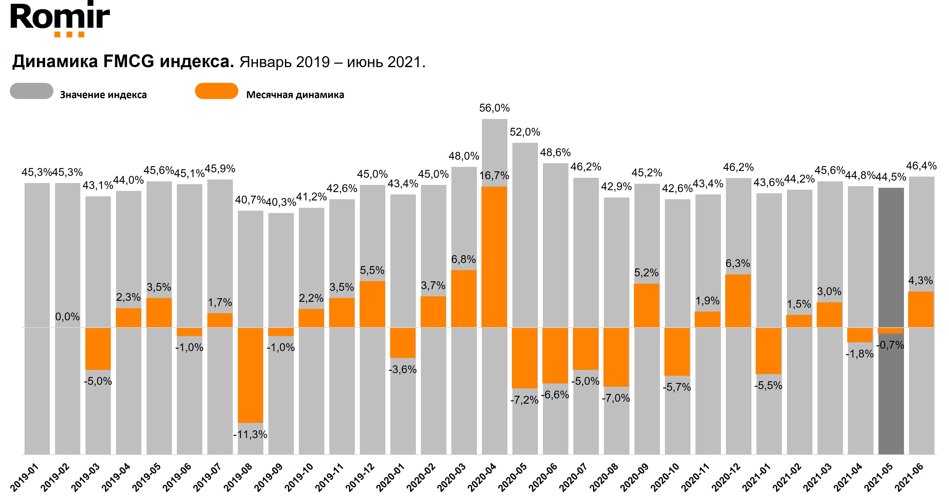 В июне 2021 года доля трат на FMCG (товары массового потребления) товары составила 46,4%, что на 4,3% больше, чем в мае 2021.