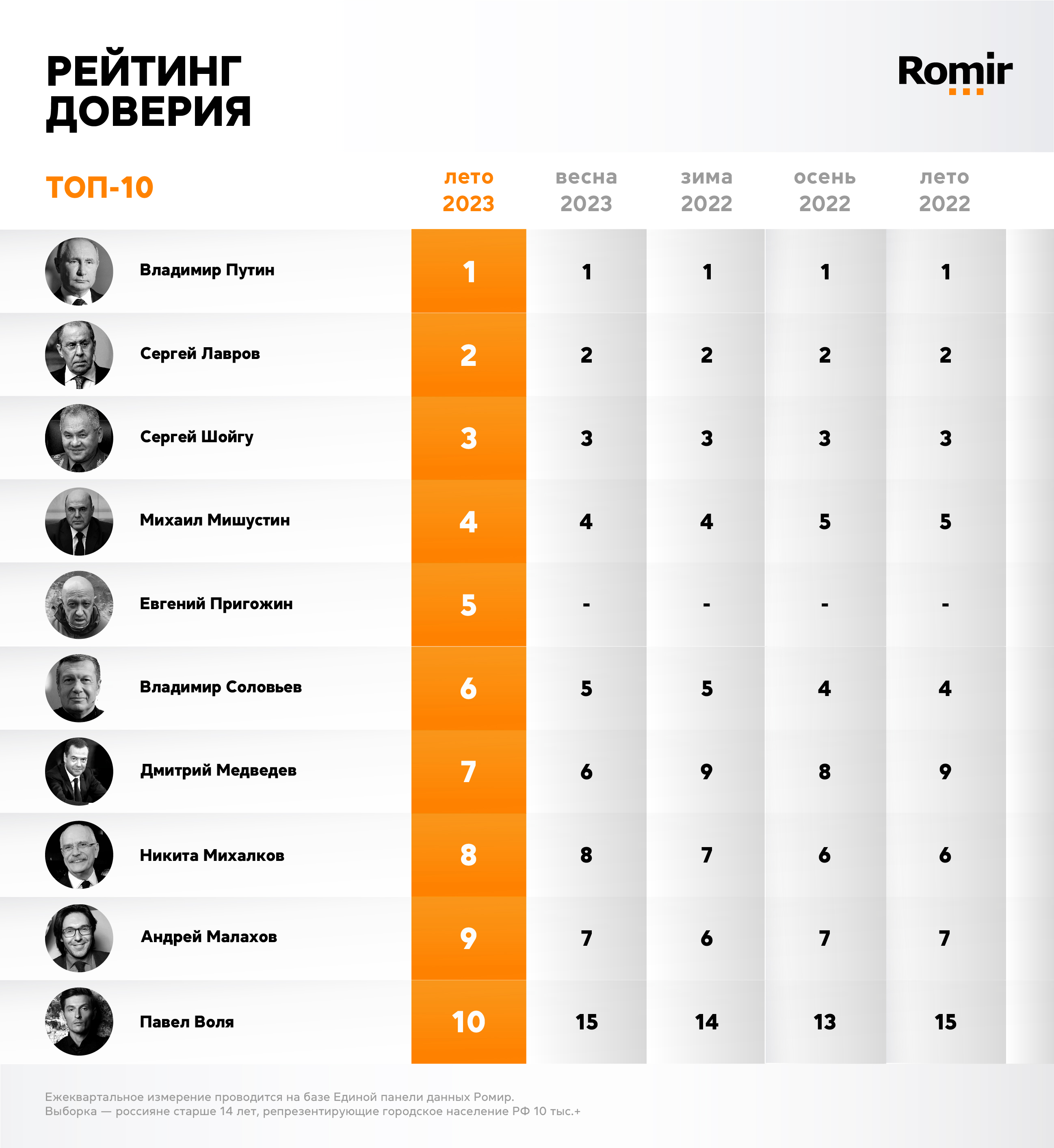 Тройка лидеров, как и в рейтинге весны, остается неизменной. Возглавляют топ Владимир Путин, Сергей Лавров и Сергей Шойгу. Новичком первой пятерки стал руководитель ГК “Конкорд” Евгений Пригожин (5 место). Из первой десятки летом 2023 года выбыли актеры Дмитрий Нагиев и Константин Хабенский, но на десятое место вернулся Павел Воля (весной 2023 он был 15-ым).