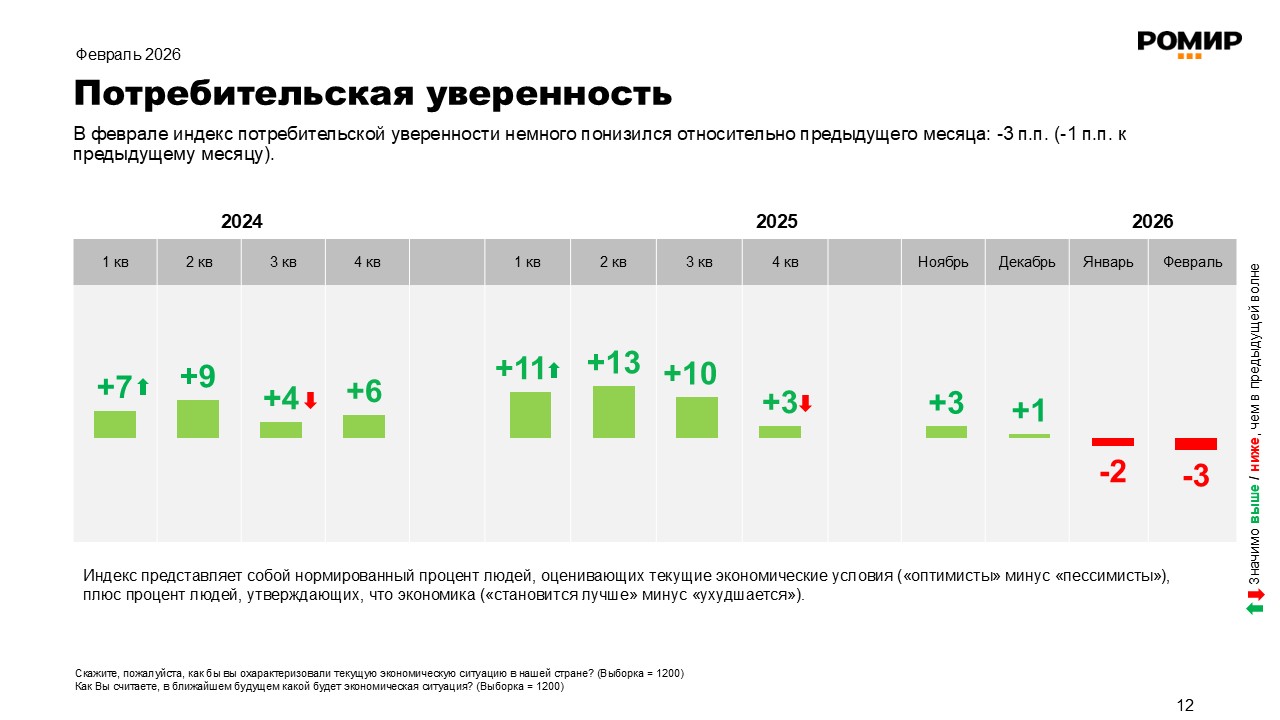 По данным РОМИР индекс потребительской уверенности (ИПУ) в России постепенно снижается, начиная с четвертого квартала 2025 года.
