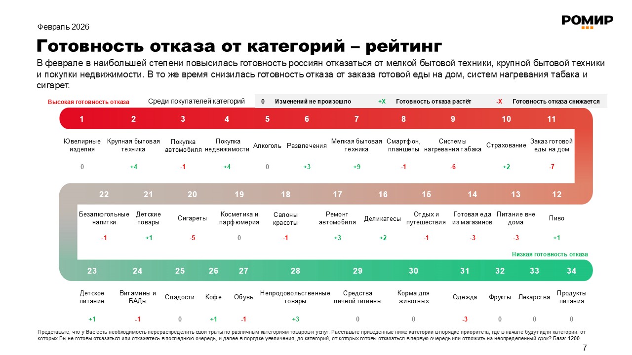 Такая картина указывает на четкое разграничение между отложенным, статусным или капиталоемким потреблением и повседневными расходами, связанными с базовым уровнем жизни. Особенно важно, что по сравнению с предыдущим месяцем заметнее всего выросла готовность отказаться от мелкой и крупной бытовой техники, а также от покупки недвижимости.